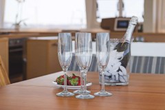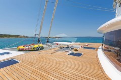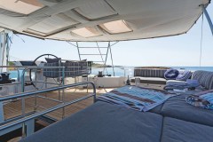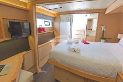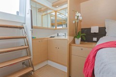 COOL BREEZE is offered primarily as a sailing catamaran. The the core layout is spread out from the main saloon, which connects to the aft deck. The aft deck is generous, with a prominent dining and seating area and that's where the guests spend most of their time. The tastefully decorated cabins offer designer mattrace beds and feature ensuite bathrooms. The cabins are located below the main saloon, connected by stairs (inquire about handicapped access). Multiple portholes offer desirable views, while providing privacy if needed.