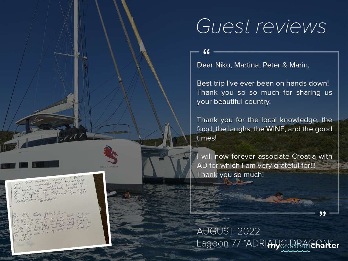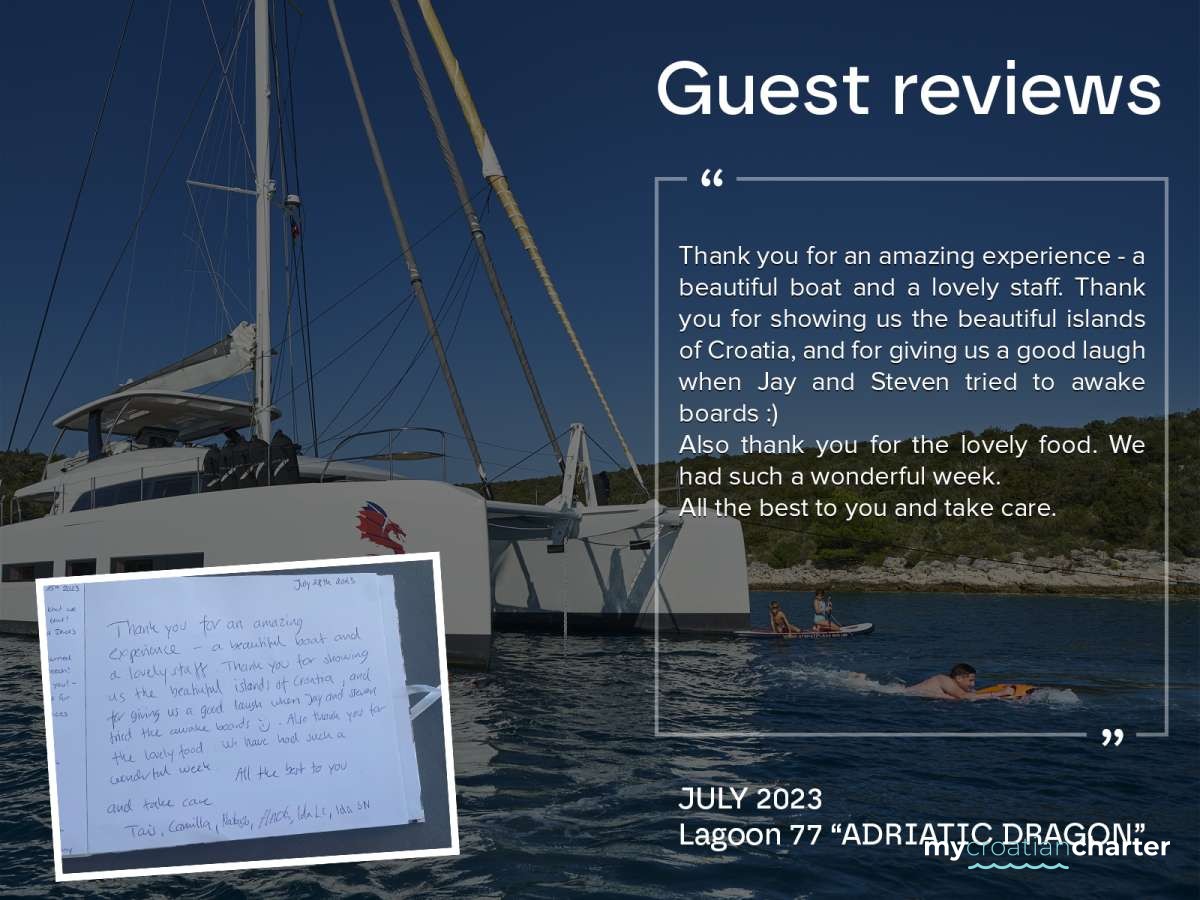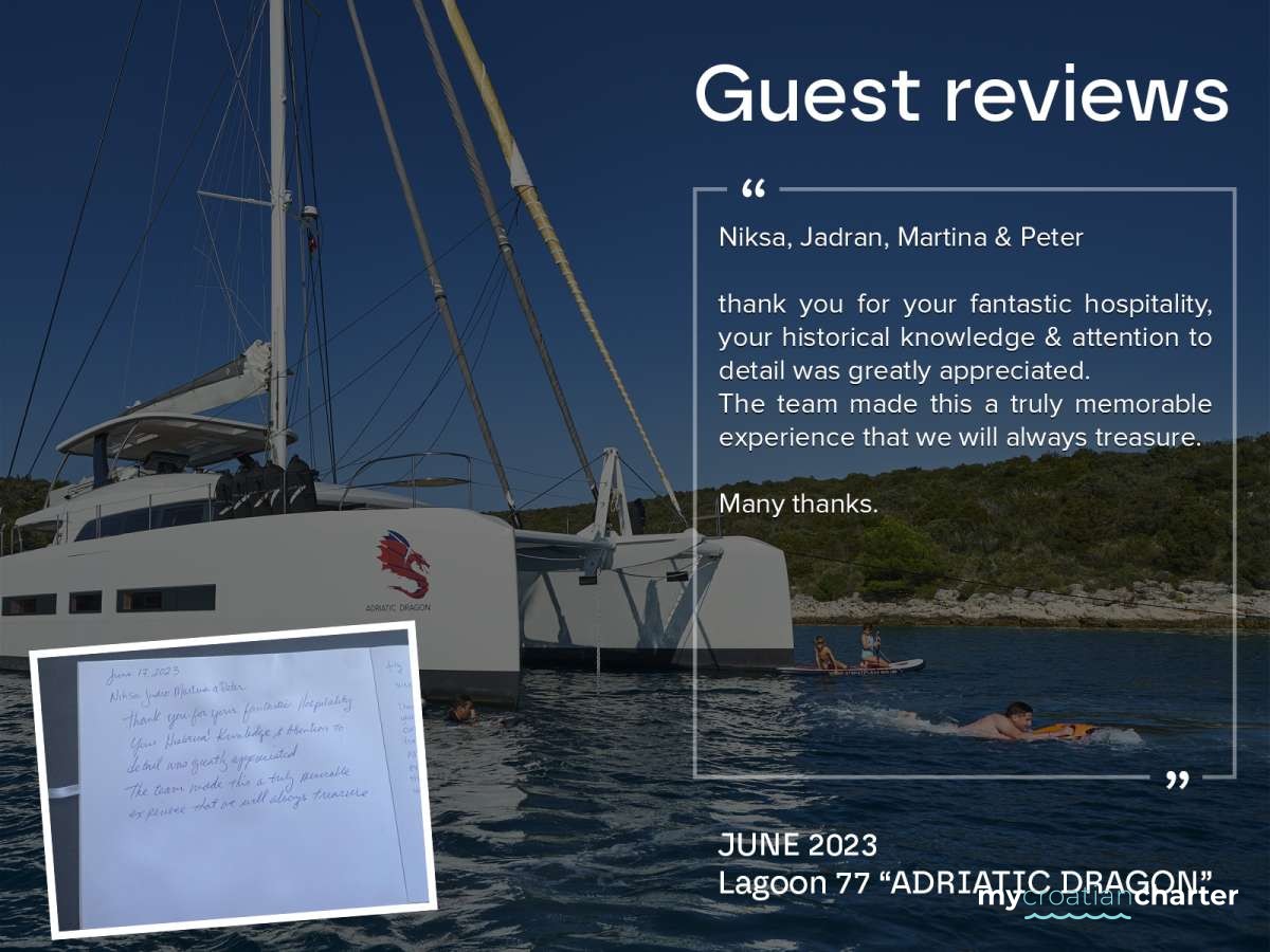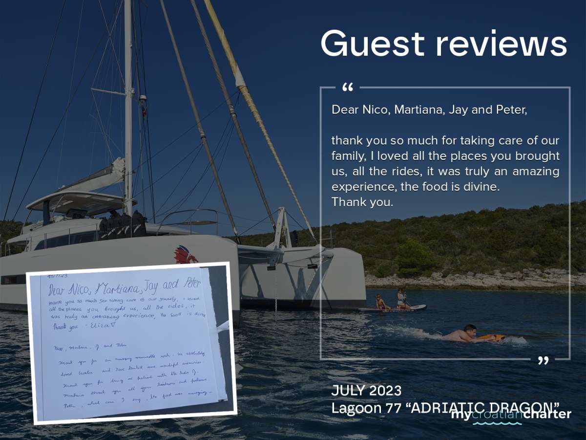 Presented by DMA Yachting, the impressive charter yacht ADRIATIC DRAGON is a 76 ft sailing catamaran featuring a jetski. The key elements of ADRIATIC DRAGON are her elegant profile and fantastic layout. ADRIATIC DRAGON spends the summer season in Croatia. She was delivered by the renowned boatbuilder Lagoon in 2019. An elegant refit was fulfilled in 2024: yacht platform, teak, ceiling completely replaced, all electronics. The spacious yacht layout features 4 generous cabins and easily accommodates a group of 8 guests.