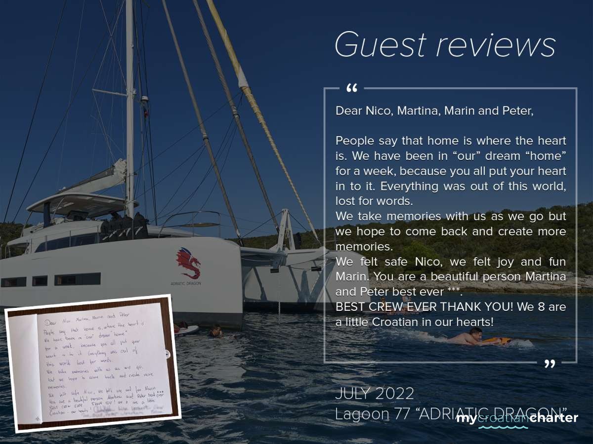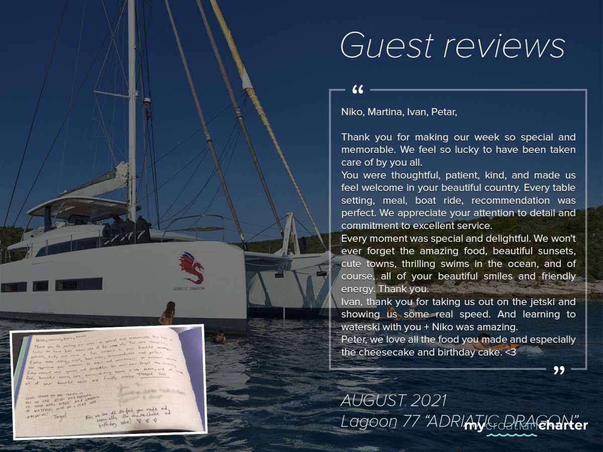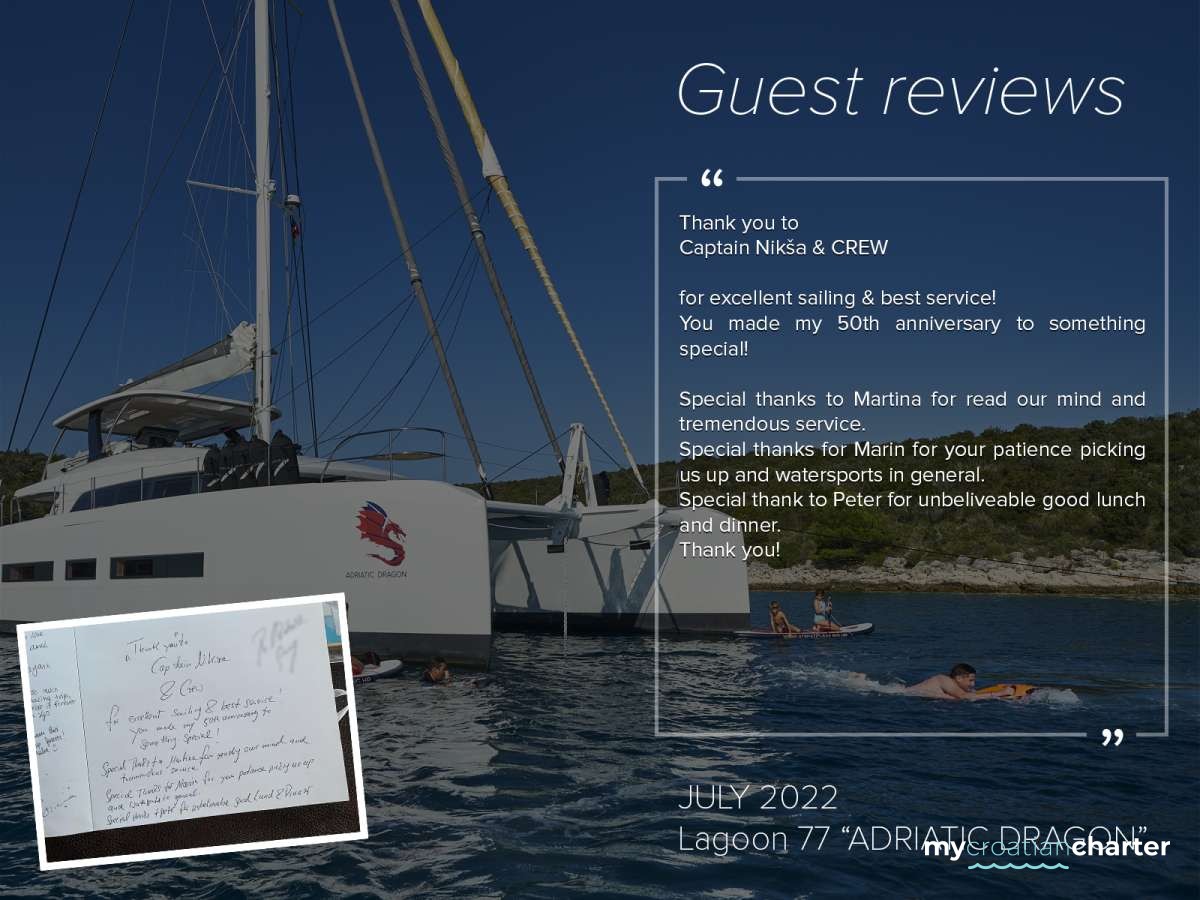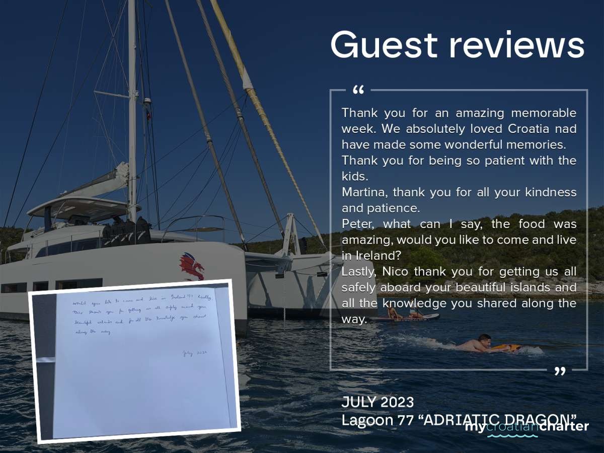 Presented by DMA Yachting, the impressive charter yacht ADRIATIC DRAGON is a 76 ft sailing catamaran featuring a jetski. The key elements of ADRIATIC DRAGON are her elegant profile and fantastic layout. ADRIATIC DRAGON spends the summer season in Croatia. She was delivered by the renowned boatbuilder Lagoon in 2019. An elegant refit was fulfilled in 2024: yacht platform, teak, ceiling completely replaced, all electronics. The spacious yacht layout features 4 generous cabins and easily accommodates a group of 8 guests.