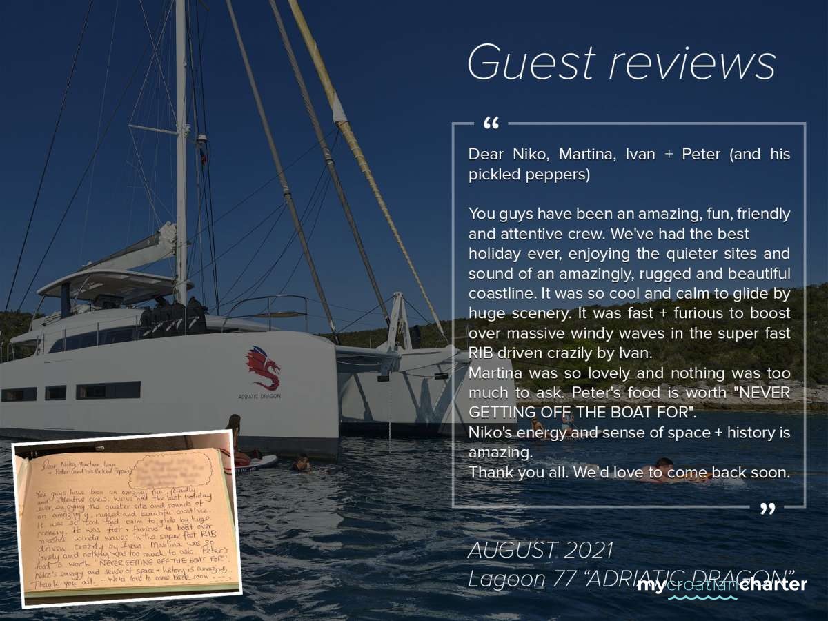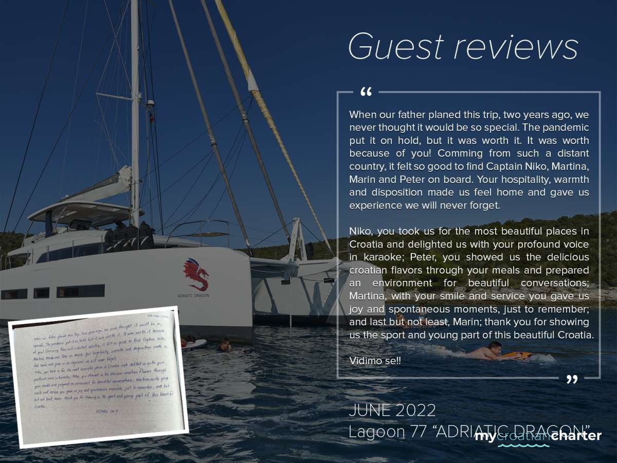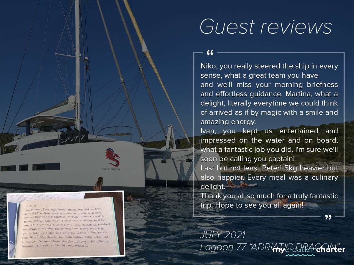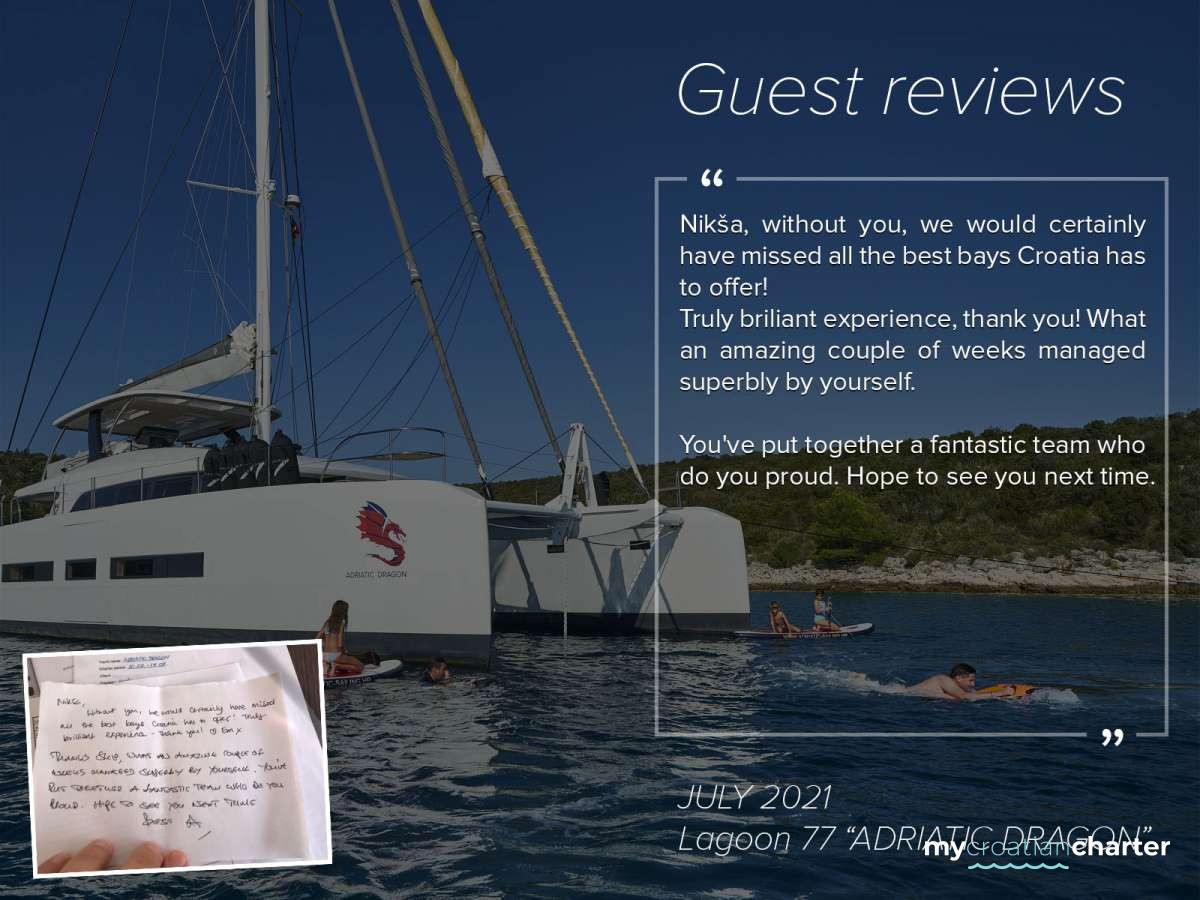 Presented by DMA Yachting, the impressive charter yacht ADRIATIC DRAGON is a 76 ft sailing catamaran featuring a jetski. The key elements of ADRIATIC DRAGON are her elegant profile and fantastic layout. ADRIATIC DRAGON spends the summer season in Croatia. She was delivered by the renowned boatbuilder Lagoon in 2019. An elegant refit was fulfilled in 2024: yacht platform, teak, ceiling completely replaced, all electronics. The spacious yacht layout features 4 generous cabins and easily accommodates a group of 8 guests.