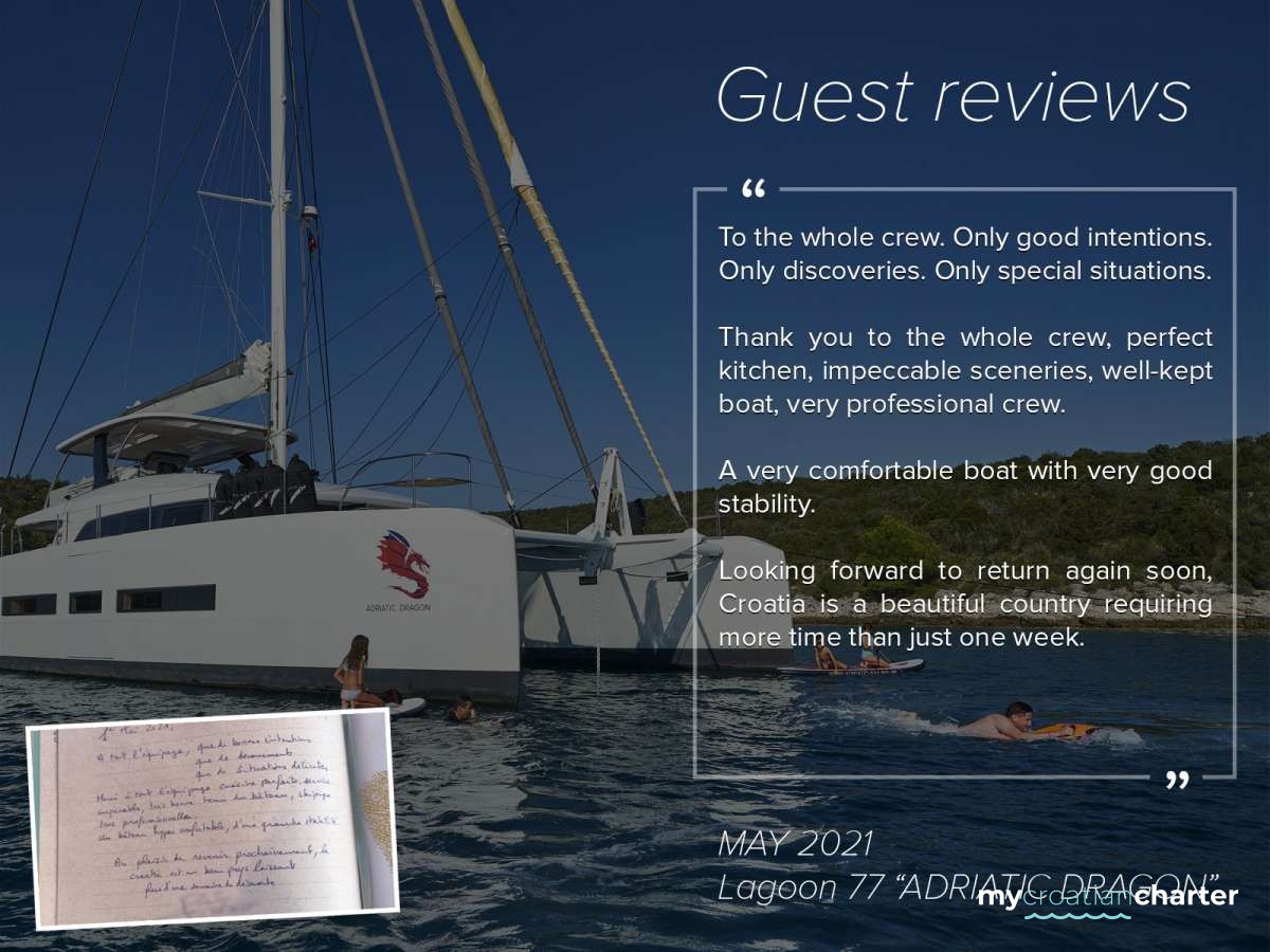 The stunning Lagoon 77' Adriatic Dragon is a catamaran that oozes pedigree and outperforms in her style, comfort, and deck areas.