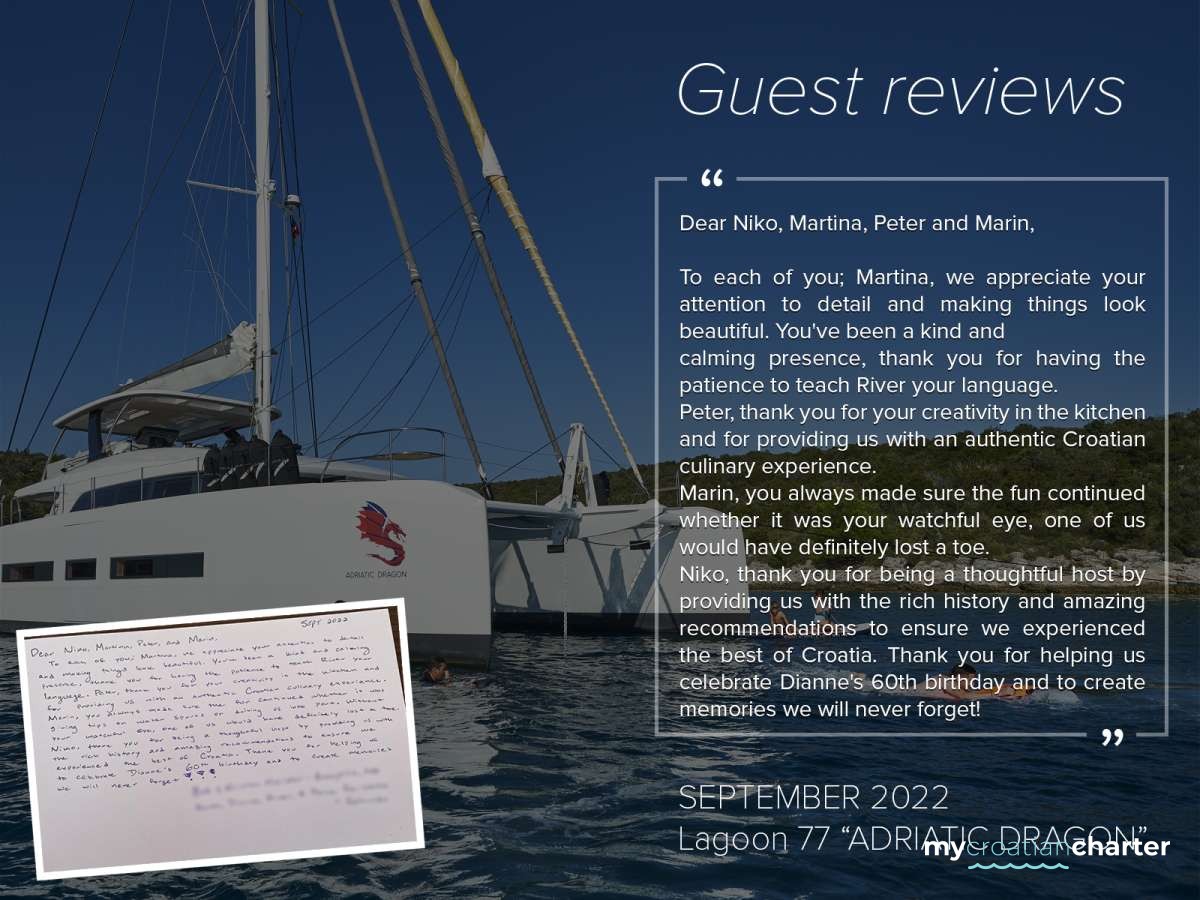 Personalized Excellence: An experienced, dedicated crew of four (Captain, Chef, Stewardess, Deckhand) ensures seamless, five-star service. Captain Niksa has been onboard for the last 5 years and together with his crew ensures a fantastic experience onboard.