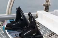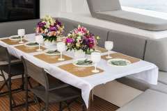 LADY M is offered primarily as a sailing catamaran. The the heart of the yacht is the main saloon, which connects to the aft deck. The aft deck is expansive, with a comfortable dining and seating area and that's where most of the delicious meals are served. The modern cabins are located below the main saloon, connected by stairs (inquire about handicapped access). The cabins are located in the 2 massive hulls. Multiple portholes add to the feeling of connection with the discovered environment.