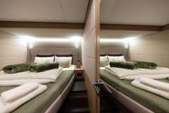 Lagoon 55 Lady M DISCOUNT: • 35% for APRIL • 25% for MAY • 20% for JUN • 15% for JULY / AUGUST • 10% for SEPTEMBER/ OCTOBER WEDNESDAY WEDNESDAY CHARTER ONLY 17:00 embarkation 08:00 disembarkation PER WEEK - PRICE LIST 2026 CROATIA + 13% Croatian VAT 01/04/2026 20/05/2026 €14,300.00 20/05/2026 27/05/2026 €21,850.00 27/05/2026 24/06/2026 €23,600.00 24/06/2026 26/08/2026 €26,700.00 26/08/2026 23/09/2026 €23,200.00 23/09/2026 30/09/2026 €16,100.00 30/09/2026 28/10/2026 €15,200.00 APA (Advance Provisioning Allowance) 8,900 EUR: - Advance Provisioning Allowance (APA): Fund board serving to cover the costs of requested supplies, port and mooring charges, diesel and fuel, communications, crew gratuities, extras and depending on your particular request for services, itinerary, food, beverages etc. The Skipper will keep an accurate record of spending and at the end of your charter you will be refunded or asked to pay the difference if additional operating costs were spent. APA is not an all-inclusive package. APA is a credit which can be spent to zero with demanding clients in 2-3 days and need to be recharged by the clients. For demanding clients we suggest to upgrade APA to double. 900 EUR Comfort pack to be taken from the APA - includes - Tourist tax and Transit log - cleaning of the boat outside/inside, gas, underwater inspection, crew list, bed linen, 2 pc. towels/person, 1 pc. beach towel/person, 1 pc. bath mat/bathroom, 1 pc. blanket/person, bed linen and towels laundry, toilet paper and liquid soap in the bathrooms, coffee capsules, sponge for dishes, dishwashing detergents, big and small trash bags, dish towels and paper towels in the kitchen. INCLUDED IN THE BASIC CHARTER PRICE: 1.) BOAT EQUIPMENT FOR FREE TIME ACTIVITIES: • Captain & Hostess/cook (hostess will prepare 2 meals a day, Breakfast & Lunch or Dinner. A 3rd meal on board 2 or 3 times in a week is also ok, at clients preference) • RIB 4,2m with 60hp engine (operated by Skipper) • Snorkeling gear: mask & flippers • 1x Donut • 2x Stand Up Paddles (SUP) • 2x SeeDoo • 1x Wakeboard • 1x Omnia MultiBoard • 1x Water Ski 2.) SERVICES: • Charter assistant 24/7, pilot books in several languages and navigation charts • Internet Starlink (data FUP 250 GB) + WiFi (AC) on board is included in basic charter price • Hilton standard (towels and bed linen) NOT INCLUDED IN THE BASIC CHARTER PRICE: Early Check in 300 EUR / charter: - after 14:00 (in case of unforeseen circumstances and repairs time shift as needed) One way 300 EUR / one way: - Marina SCT - Dubrovnik. This package is ONLY for transferring the boat back to Trogir. Marina fee and fuel are not included in this package. Lagoon 55 LM - clients need to check out in Dubrovnik Tuesday morning at 8:00 am. Wine Tasting 400 EUR / charter: - selection of the best Croatian wines on the boat. Wines are from the best Croatian wine producers from Brač, Hvar and Pelješac. Package include 2 white and 5 red wines (Matuško, Korta Katarina, Stina, St. Hills and one special hidden winery).What is the cabin arrangement of LADY M?
