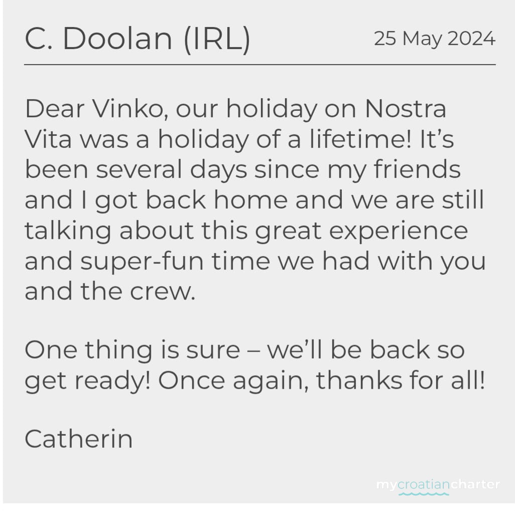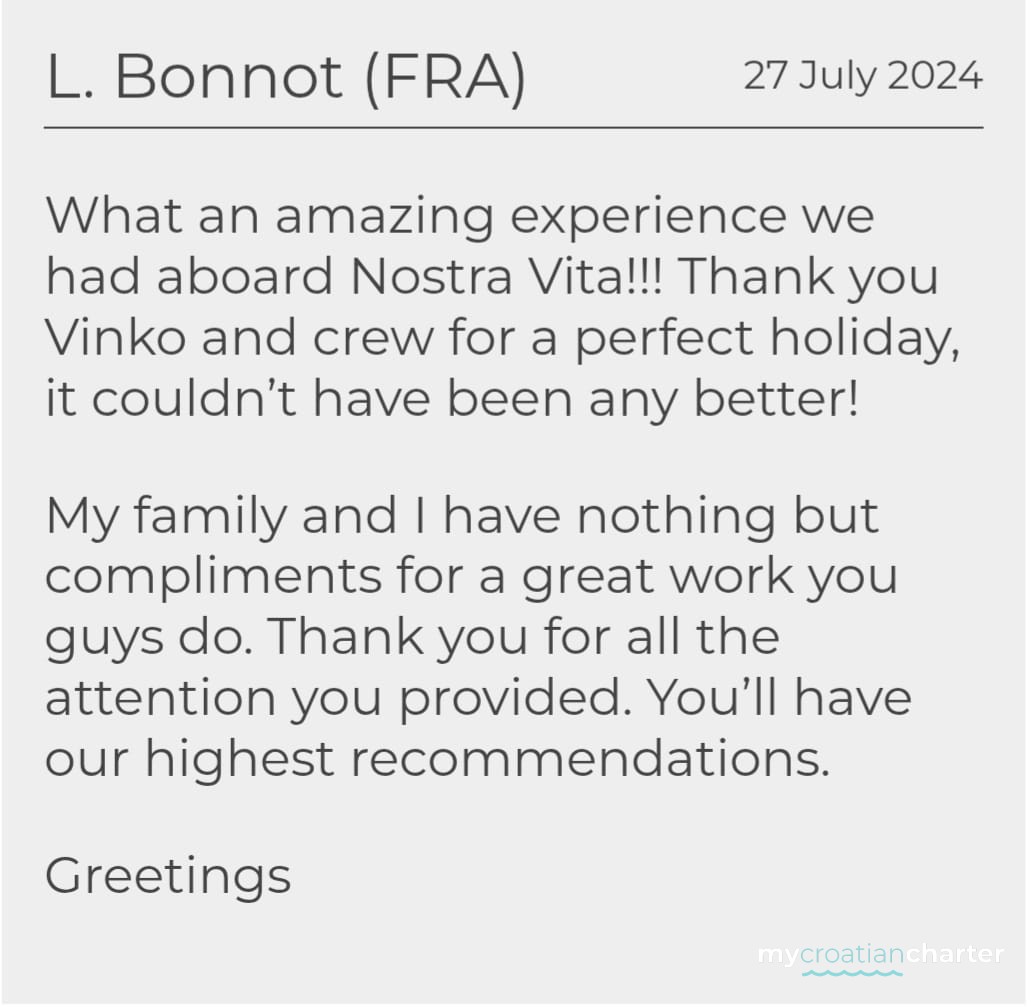************************************************************************************************* EXTRA BROKER INCENTIVES ARE AVAILABLE BROKERS PLEASE ENQUIRE ************************************************************************************************* Special promotional rates available for this season only 2026 CHARTER RATES 01.05 - 30.05 17,700 Euro plus 13% VAT 30.05 - 13.06 20,353 Euro plus 13% VAT 13.06 - 27.06 22,124 Euro plus 13% VAT 27.06 - 29.08 23,894 Euro plus 13% VAT 29.08 - 12.09 22,124 Euro plus 13% VAT 12.09 - 03.10 20,353 Euro plus 13% VAT 03.10 - 30.10 17,700 Euro plus 13% VAT The charter rate includes fuel for 4 hours of cruising per day, 12hr AC, the use of non - motorized water toys and WIFI. Extras: 1. CHARTER FEE Includes: Shipboard accommodation, permits, insurance, all equipment on board, tender with outboard engine, linens and towels, fuel for main engine, 4 h of navigation per day, yacht cleaning, sojourn taxes, gasoline for tender, diesel for generator (12h/day AC), Internet connection. 2. FOOD OPTIONS Half board: 550 € per person/week (breakfast, lunch OR dinner) Full board: 850 € per person/week (breakfast, lunch and dinner) An extra meal charged at 60.00 Euro per person (max 2 dinners per week if on a half board arrangement) Tea, coffee and water free of charge during meals Discount for children's food: 0 to 2 years old free of charge and a 35% discount for 2 to 10 years old 3. BEVERAGE OPTIONS A) Beverages on yacht bar only - by bar price list, in this option clients are not allowed to bring their own beverages on board. B) - All inclusive domestic package - includes Croatian wines, beers, spirits, soft drinks, natural and mineral water, coffee, tea, juices - 350 Euro per person per week - All inclusive dom. non alcoholic package - 190 Euro per person per week All Inclusive drinks package: 450 Euro per person per week (Croatian quality wines Rose, Red, White, Croatian Lager beer, water, carbonated drinks, juices, Gin Sapphire Bombay, Jameson Whiskey or Johnnie Walker Red Label, Absolut Vodka, Tequila J. Cuervo) C) Beverages completely supplied by clients - cost service of beverages: 1,500 Euro per week EXTRA COSTS - Port and marina fees (between 1,200 to 2,000 Euro per week depending on the route) - Delivery Fee for embarkation / disembarkation in any other port except base port, charged only if empty leg is caused 1,500 Euro - Watersports which require dinghy: 100 € per hourWhat is the cabin arrangement of NOSTRA VITA?