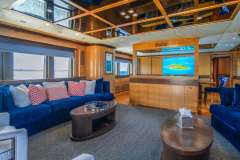A sky lounge on the upper deck, featuring a fully equipped bar, poker table, and cinema area with a large TV for movie nights.