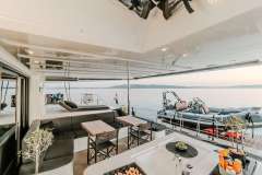 TRIWING OSSUS is presented primarily as a sailing catamaran. The the core layout is spread out from the main saloon, which connects to the aft deck. The aft deck is generous, with a prominent dining and seating area and usually it is where you, as a charter guest, spend most of your time. The tastefully decorated cabins offer designer mattrace beds and feature ensuite bathrooms. The cabins offer unbeatable views in the morning and are located just below deck. Multiple portholes add to the feeling of connection with the discovered environment.